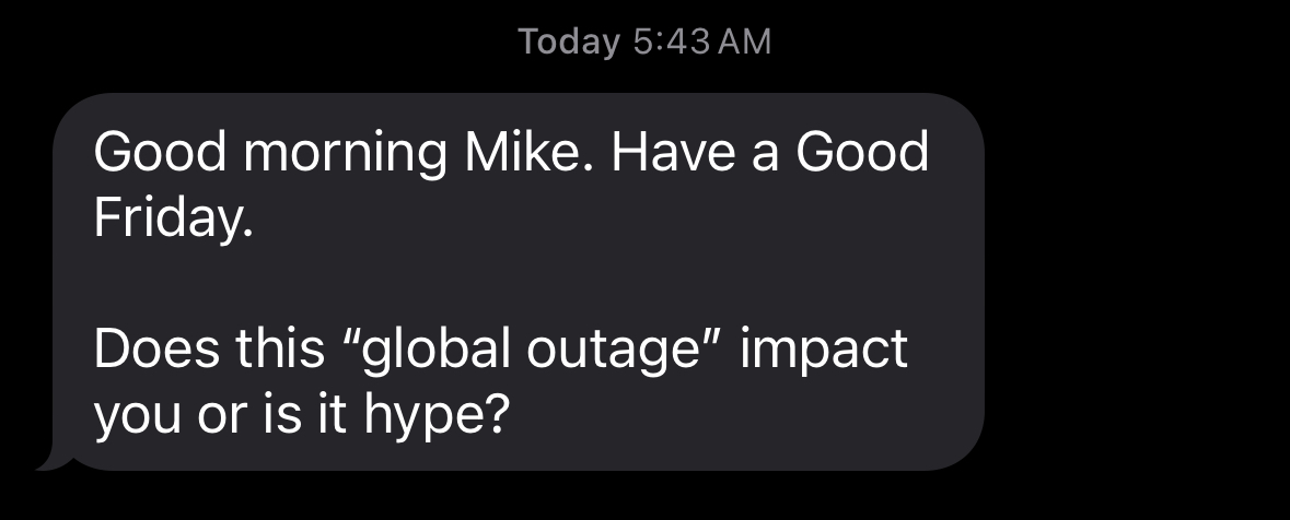 July 19th – Like most days, I’m up early – take care of some personals, make coffee, and look for the latest in cyber news aka I hop on Twitter (X? we calling it that yet?) and look for a rabbit hole. Today I caught a text from my Dad first thing – sidebar my Dad introduces me as his son who works on computers.